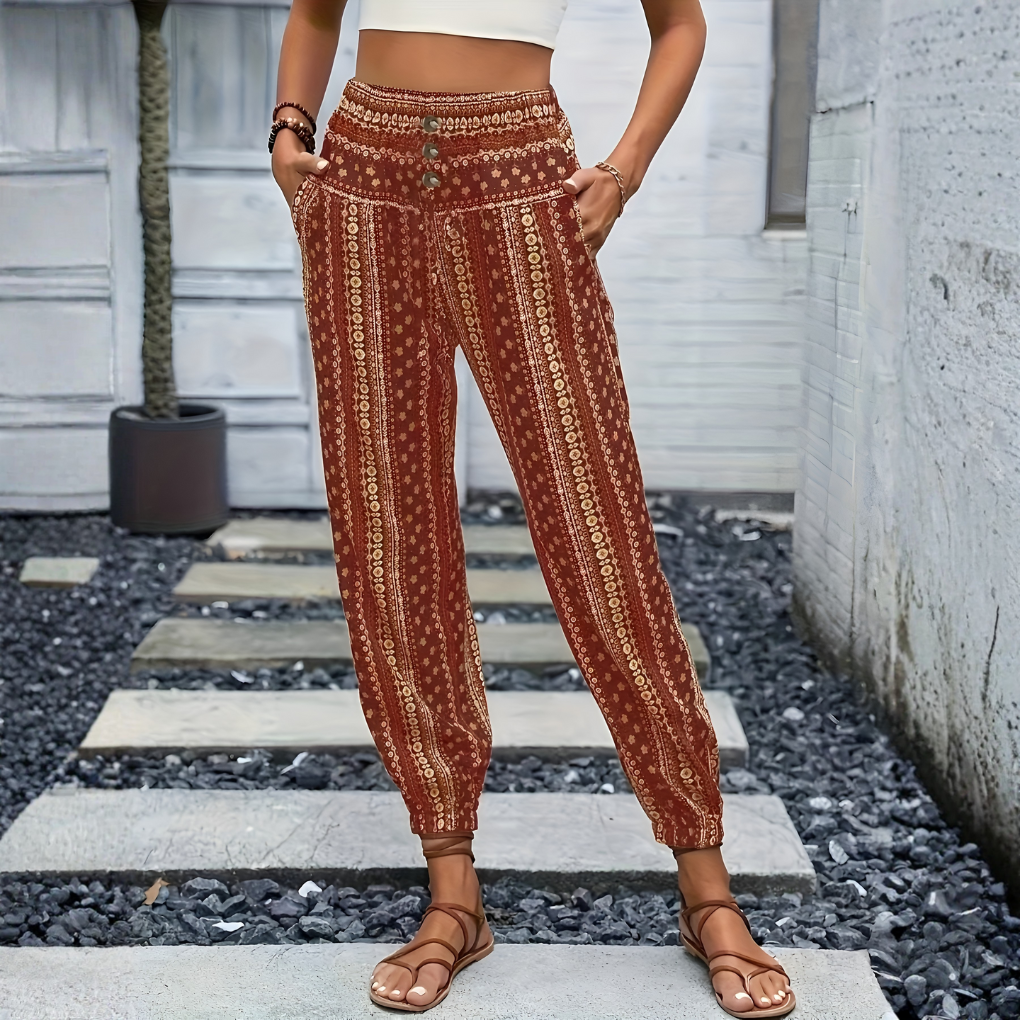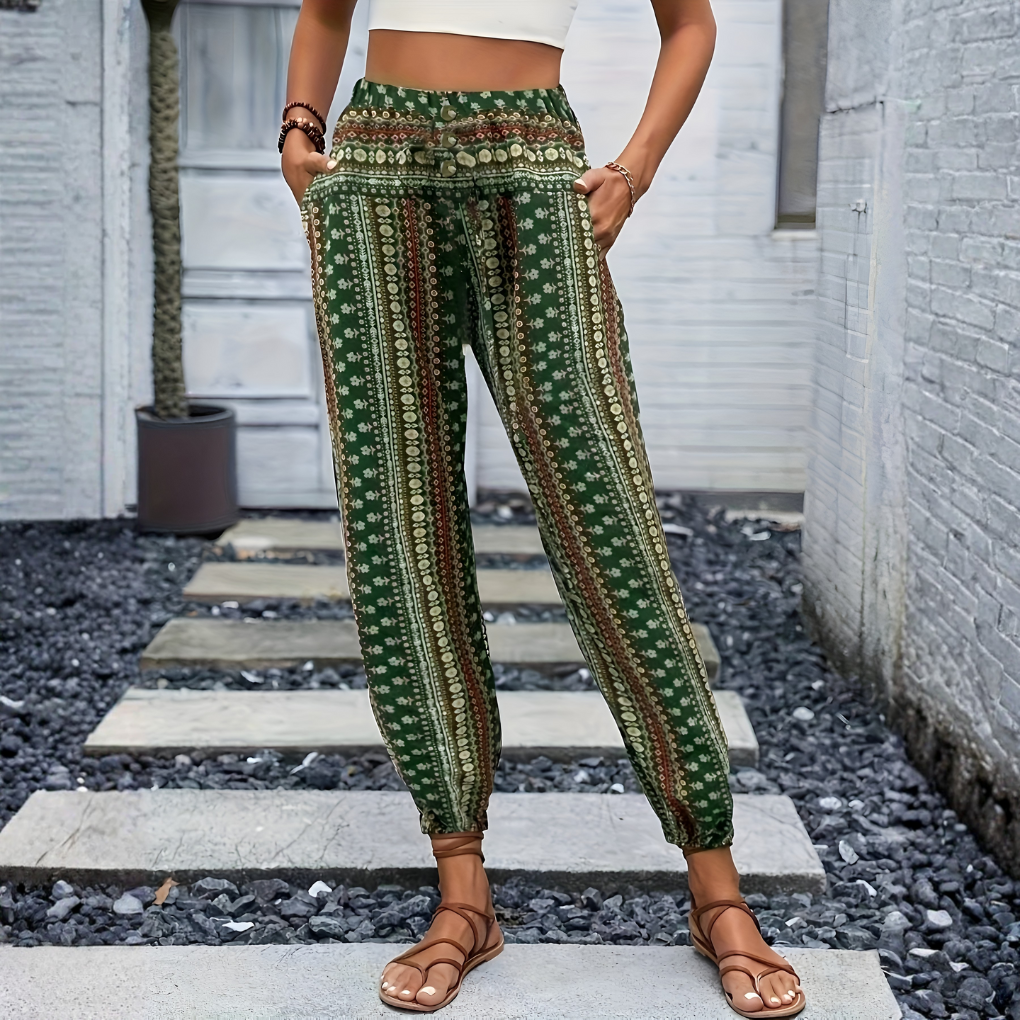 Disse boheme-inspirerede højtaljede bukser kombinerer afslappet stil med daglig komfort, hvilket gør dem til et alsidigt tilføjelse til din garderobe. Deres afslappede pasform og flatterende talje giver et smart og behageligt look, der passer til forskellige lejligheder.