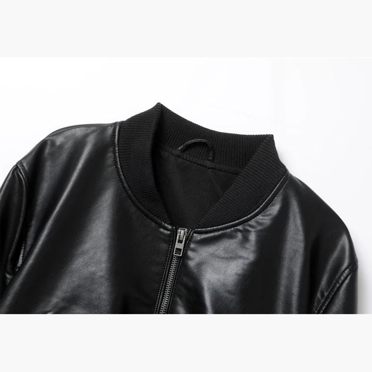 Denne bomberjakke i vintage-stil til kvinder er fremstillet i kunstlæder og har et blødt polyesterfor, der giver en komfortabel pasform og klassisk retro-look. Designet inkluderer en ribbet bomberkrave, lange ærmer, og ribbede manchetter og kant, hvilket fuldender den afslappede silhuet.