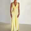 Denne elegante aftenkjole har en luksuriøs satinfinish og en sofistikeret halterneck-udskæring, hvilket gør den til et ideelt valg til formelle begivenheder. Det ærmeløse design og den tætsiddende overdel skaber en flatterende silhuet, mens maxi-længden tilføjer et strejf af tidløs elegance.