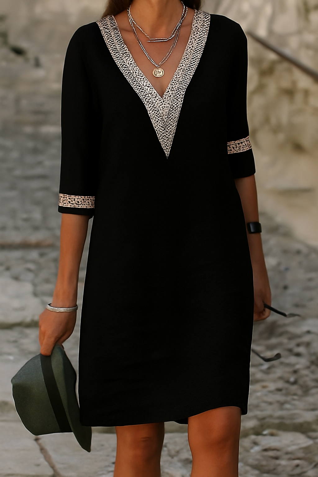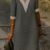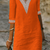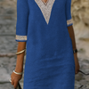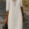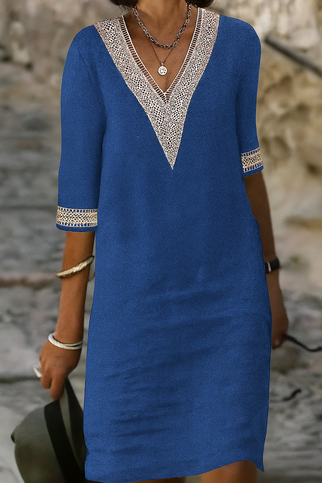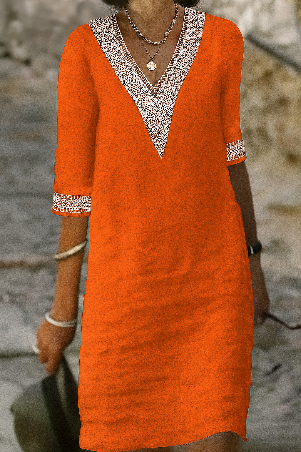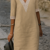 Giv din garderobe et strejf af retro charme med denne minikjole med V-hals i en blanding af bomuld og hør – en perfekt blanding af afslappet komfort og feminin elegance. Denne kjole, der går over knæet, har en løs talje og en flatterende A-formet silhuet, yndefulde ærmer med vidde og fine blondedetaljer, der giver et vintage-inspireret look. Det åndbare stof og pullover-stilen gør den ideel til varme dage eller lag-på-lag-outfits i køligere vejr.